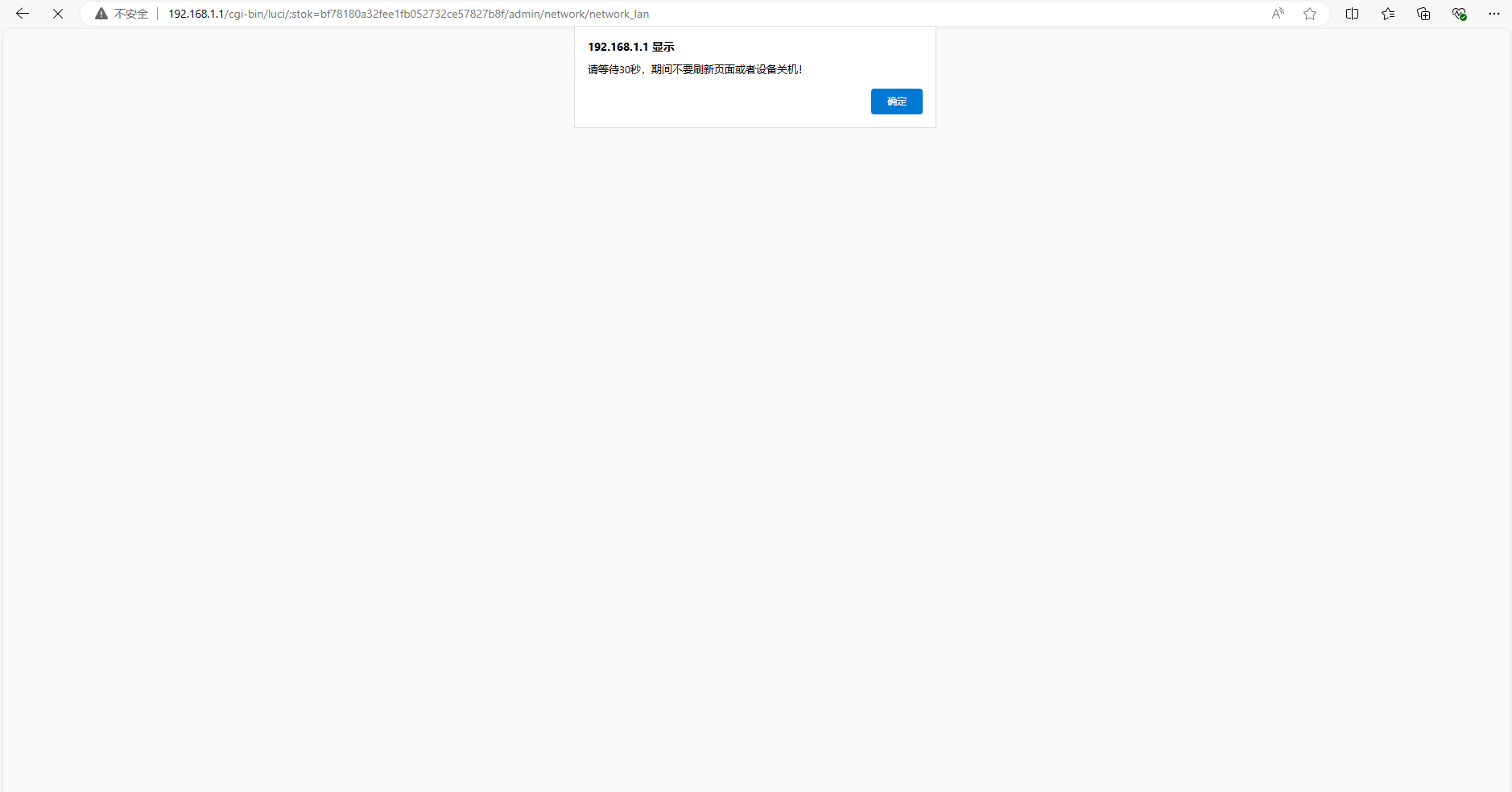 (2)網(wǎng)頁提示等待30秒,期間不要刷新頁面或者設(shè)備關(guān)機(jī)。網(wǎng)頁會自動跳轉(zhuǎn)到LAN頁面。可以看到LAN1的網(wǎng)關(guān)IP是192.168.1.1,LAN2的網(wǎng)關(guān)IP是192.168.2.1。