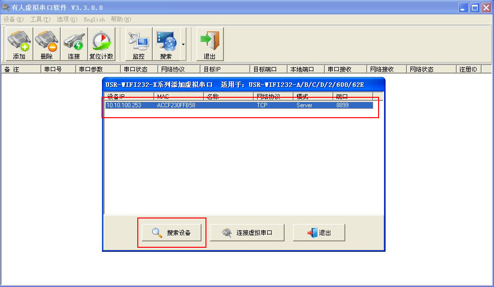 打開(kāi)有人虛擬串口軟件USR-VCOM,點(diǎn)擊搜索,選擇“USR-WIFI232-XX”系列產(chǎn)品