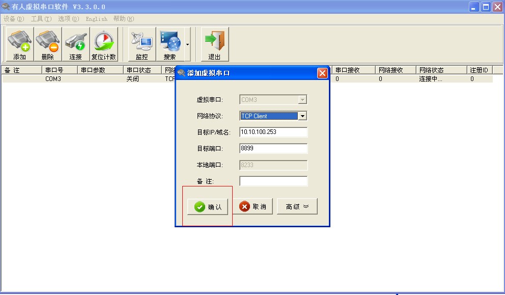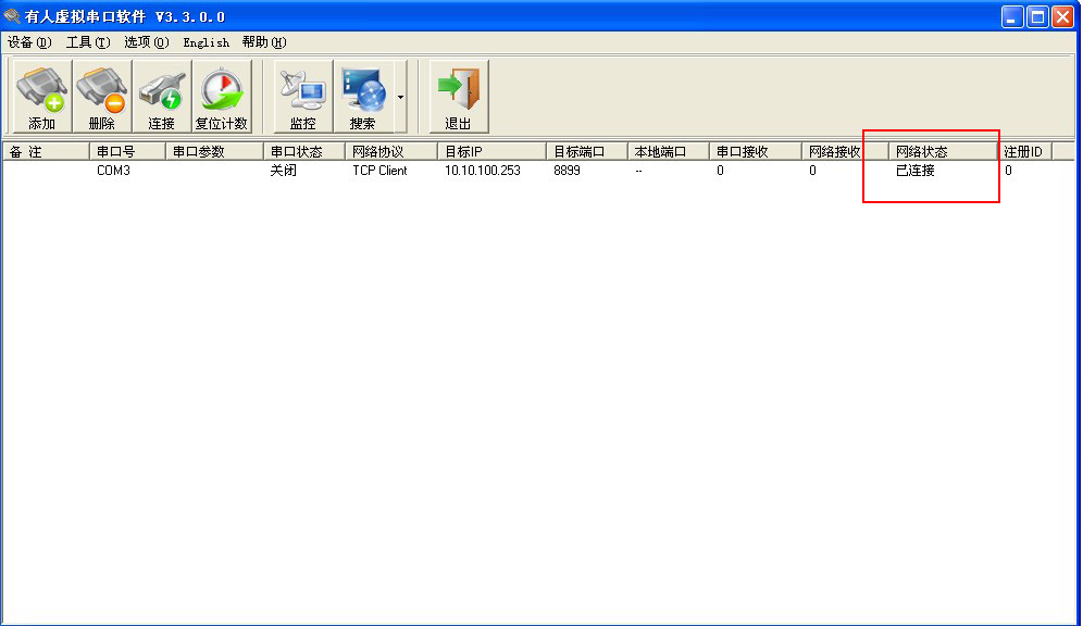 6.此時(shí)虛擬串口建立完畢,查看網(wǎng)絡(luò)狀態(tài)為已連接,則證明網(wǎng)絡(luò)通信已成功。如果網(wǎng)絡(luò)狀態(tài)為監(jiān)聽(tīng)或連接失敗,擇注意計(jì)算機(jī)上是否有雙網(wǎng)卡,禁用掉不用的網(wǎng)卡。查看是否開(kāi)啟了WINDOWS防火墻,關(guān)閉防火墻。