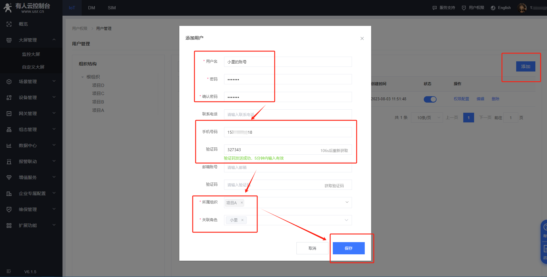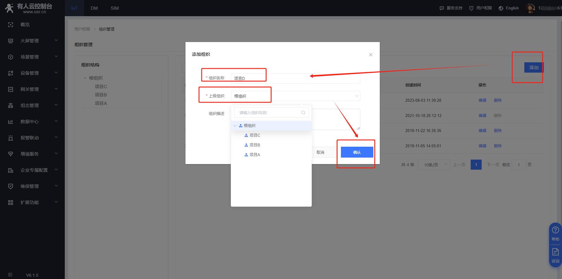 在iot平臺(tái)——用戶(hù)權(quán)限——組織管理,添加新組織,組織名稱(chēng)可以自定義,上級(jí)組織選擇在在哪個(gè)組織下添加為新的組織,案例里上級(jí)組織是選擇的根組織,點(diǎn)擊確定,可以看到新添加的組織