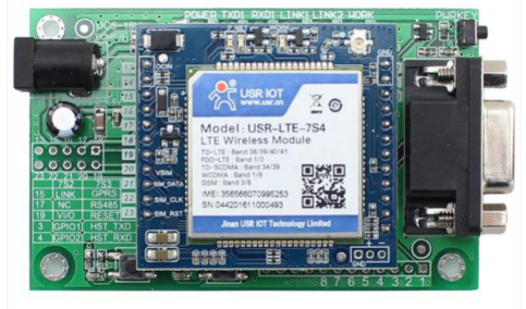 將4G模塊USR-LTE-7S4安裝在測試底板上,安裝上天線,將SIM卡槽打開,正確放入SIM卡,使用USB轉RS232的串口線(公頭)與測試底板對接上。