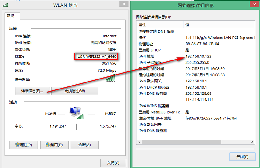 7、電腦連接wifi模塊AP的SSID名稱,可以獲取到路由器網(wǎng)段的IP,可與路由器內(nèi)局域網(wǎng)電腦或網(wǎng)絡(luò)設(shè)備通信。