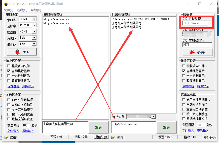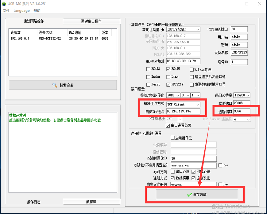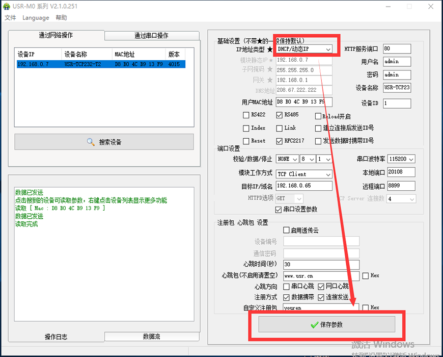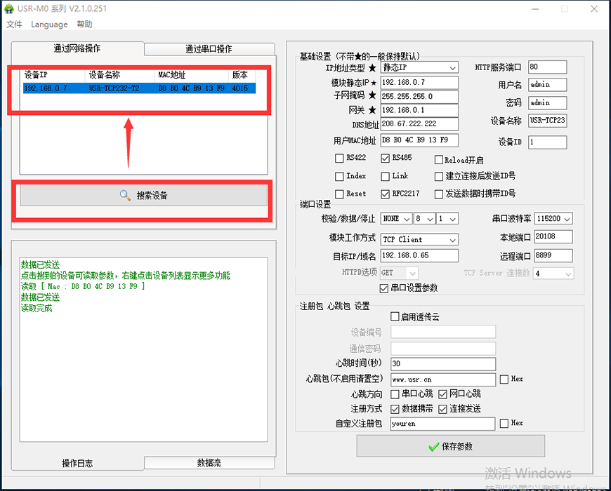 5、打開參數設置軟件USR-TCP232-M0-V2.1.0.251.exe ,點擊“搜索設備”,點擊搜索到的模塊IP,選擇是通過RS485串口還是RS232串口進行通信,此處以RS232串口舉例,配置參數如圖,點擊“保存參數”
