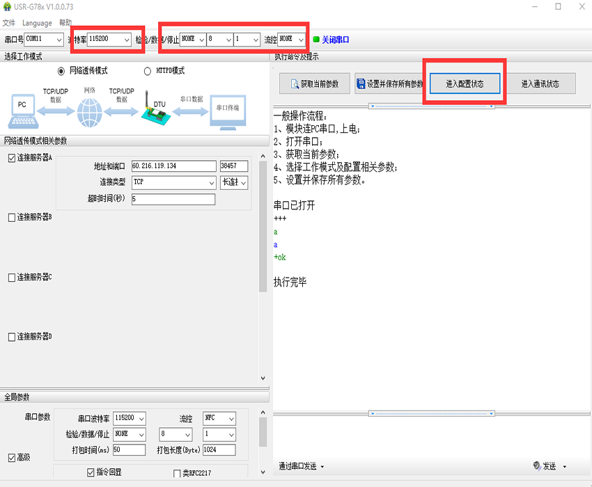 1、將USR-LTE-7S4模塊插入評估板,插入sim卡,串口連接電腦,打開參數設置軟件(下載地址http://m.0575400.com/Download/415.html),模塊默認串口參數是115200,N,8,1。點擊“進入配置狀態”,如圖