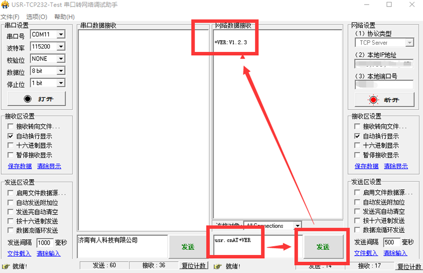 5、通過服務器端網絡調試助手發送帶有密碼(默認是usr.cn)的AT指令可以實現網絡AT指令功能,如查詢模塊版本號可以發送:usr.cnAT+VER?跟回車,如圖