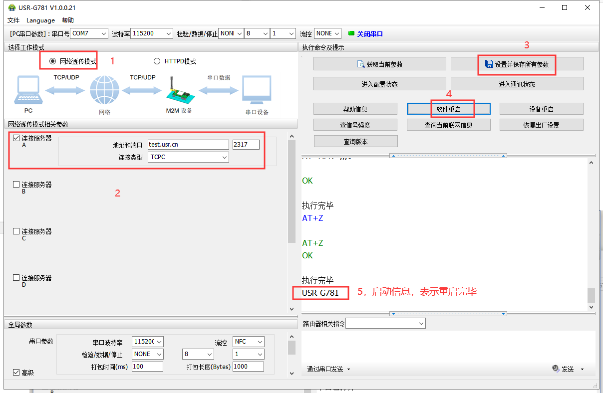 5>待重啟完畢后會在串口打印USR-G781字樣,表示設備啟動完成。設備上的linkA指示燈常亮,表示socketA建立連接