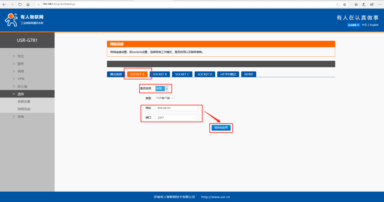 2>選擇SOCKETA,啟用,設置地址和端口為test.usr.cn,2317,保存并應用