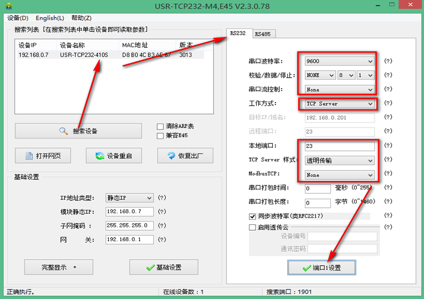 一、將串口服務(wù)器網(wǎng)口直連電腦網(wǎng)口或者連接路由器網(wǎng)口。使用設(shè)置軟件設(shè)置參數(shù):搜索設(shè)備,設(shè)置串口服務(wù)器的IP地址與局域網(wǎng)網(wǎng)段一致,設(shè)置串口服務(wù)器的波特率為9600,校驗數(shù)據(jù)位停止位:NONE 8 1。這個參數(shù)要和PLC的參數(shù)一致,然后點擊端口1設(shè)置。