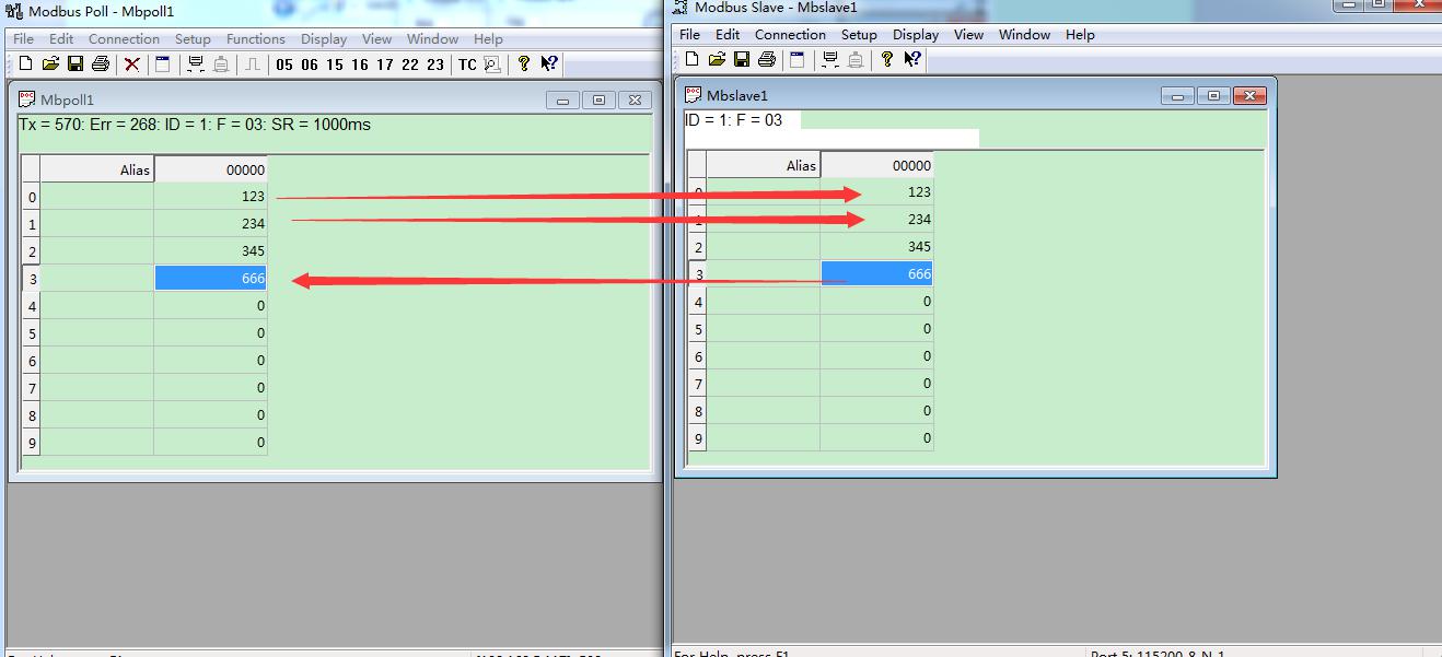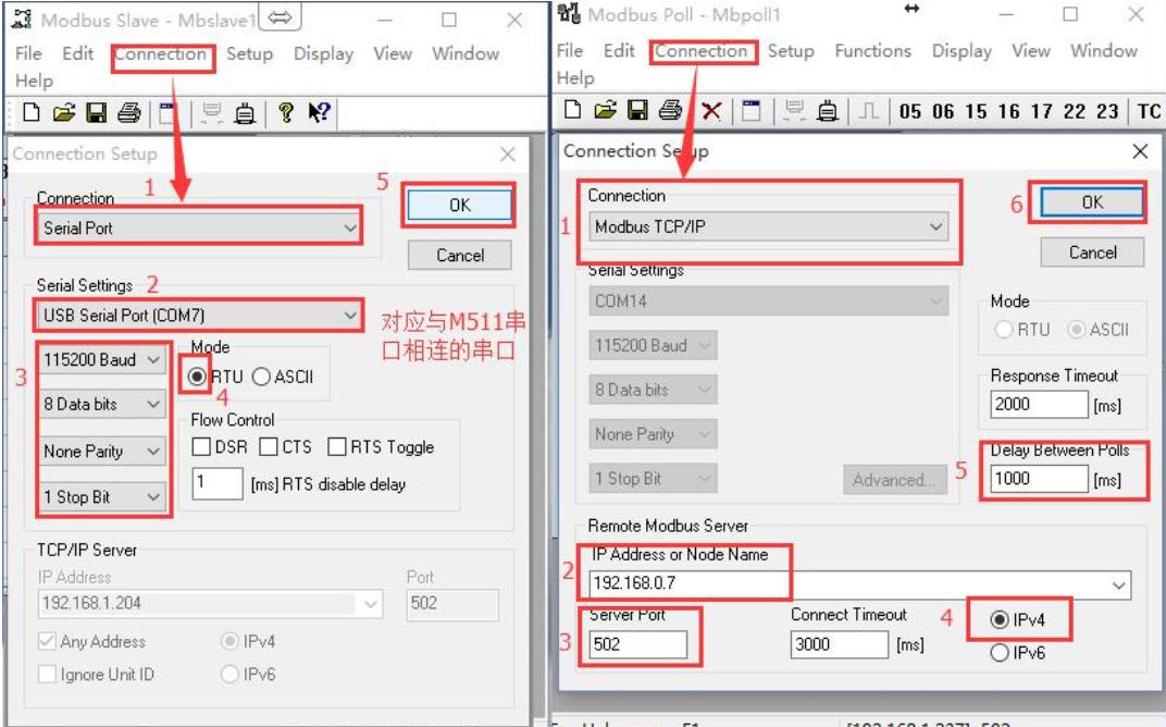 4、 打開測試軟件“Modbus Poll” 和“Modbus Slave”連接好硬件。