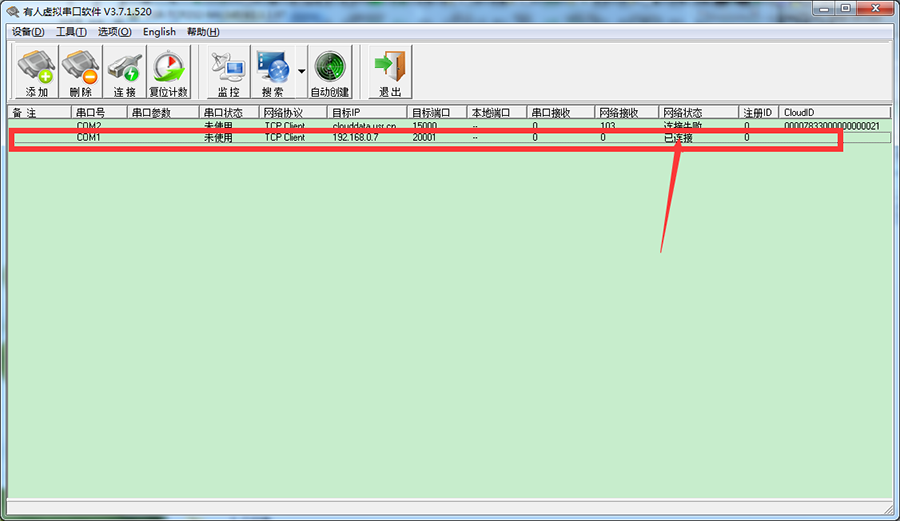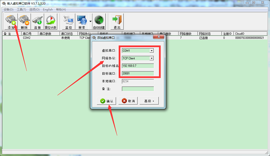 七、打開(kāi)虛擬串口軟件,點(diǎn)擊“添加”在彈出的窗口中設(shè)置虛擬串口信息,由于上述N668設(shè)備采用TCP server協(xié)議,所以此處網(wǎng)絡(luò)協(xié)議設(shè)置為TCP client。目標(biāo)IP和目標(biāo)端口設(shè)置為N6680的IP和端口。然后點(diǎn)擊“確定”,建立虛擬串口COM1。