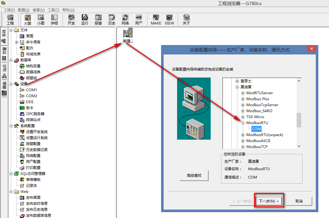 4.3點擊設(shè)備,新建一個組態(tài)設(shè)備,選擇 PLC-莫迪康-Modbus RTU-COM,點擊“下一步”
