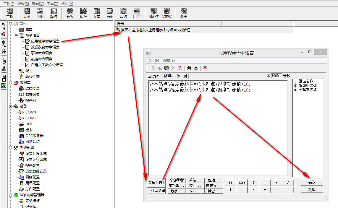 4.7 點擊“命令語言”中的“應(yīng)用程序命令語言”,然后輸入算法,“濕度初始值”采集到的數(shù)據(jù)除以10,然后將數(shù)據(jù)賦值給“濕度最終值”,此變量對應(yīng)的是實際的濕度值?!皽囟瘸跏贾怠辈杉降臄?shù)據(jù)除以10,然后將數(shù)據(jù)賦值給“溫度最終值”,此變量對應(yīng)的是實際的溫度值。