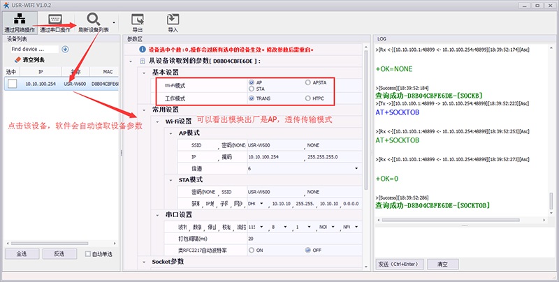 3> 打開設置軟件,選擇“通過網絡搜索”-->“刷新設備列表”,就能夠搜索到W600這個設備;可以在這個軟件中根據實際應用修改W600的各種參數,這里我們只是做入門測試,就按照出廠默認的方式來測試。