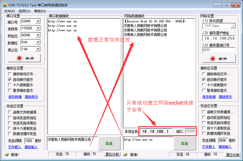 從下圖可以看出,串口和網絡端可以正常的雙向數據收發