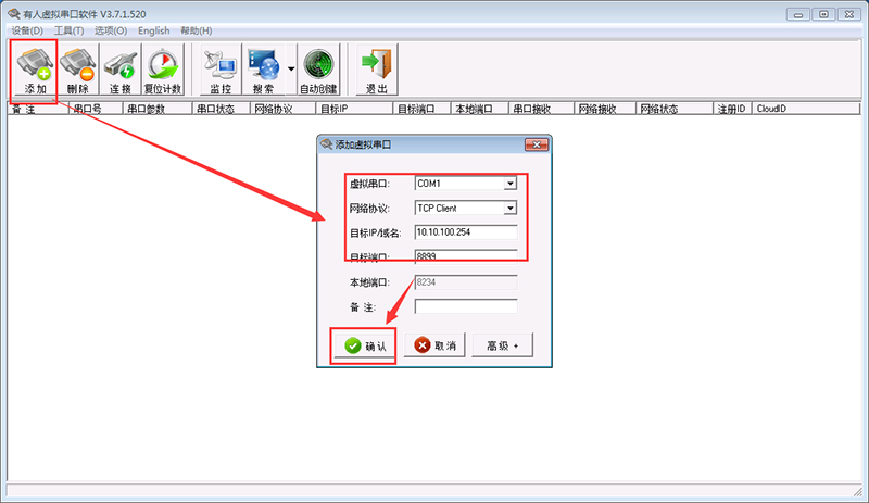 1>添加虛擬串口,網絡協議TCP client,服務器IP地址10.10.100.254,服務器端口號8899,確認