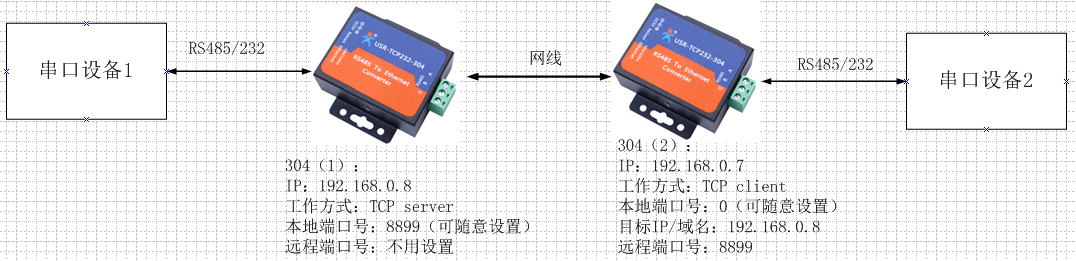 網絡拓撲結構: 串口設備1發送數據--->304(1)--->304(2)--->串口設備2接收數據