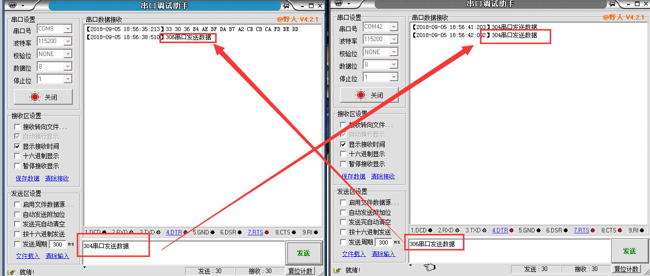 7. 電腦端打開兩個串口調試軟件,通過304和306的串口發送數據