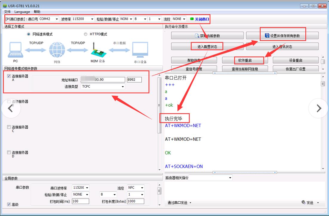 打開串口--->進入配置狀態--->成功的話,會返回執行完畢--->勾選連接服務器A,修改服務器地址和端口--->設置并保存參數--->軟件重啟或者設備重啟(軟件重啟速度要快一些),重啟后,可以看到LINKA指示燈常亮