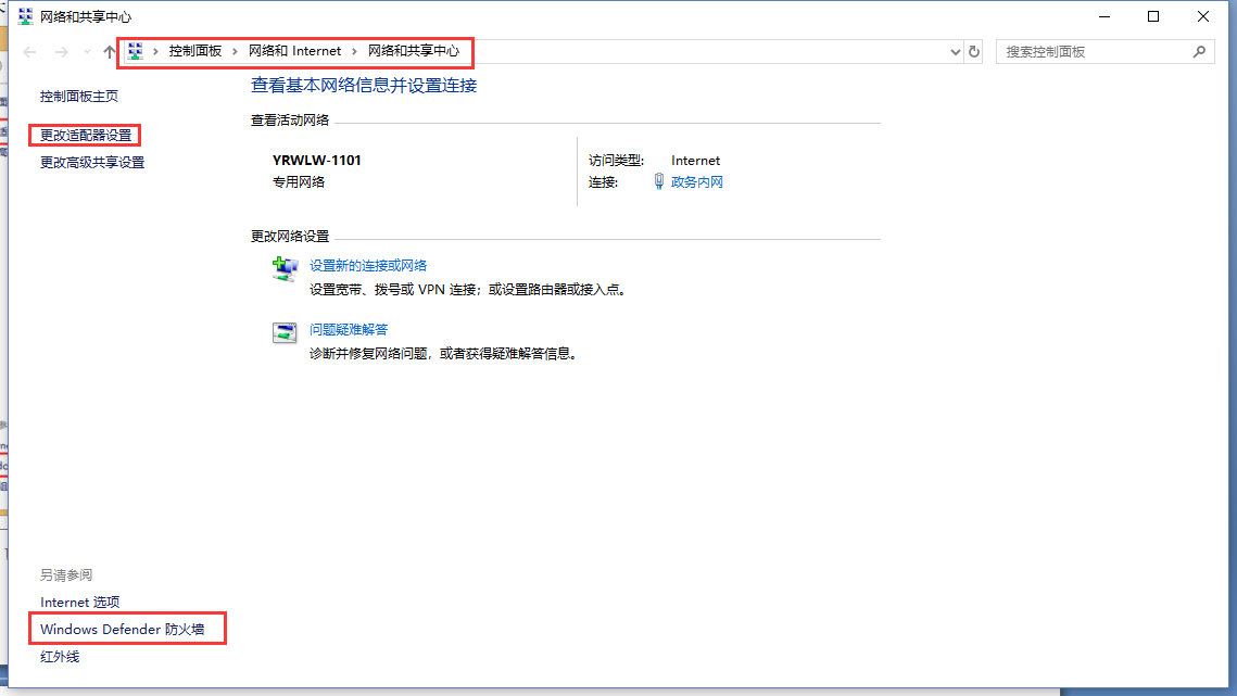 2.按路徑:控制面板》網絡和Internet》網絡和共享中心找到“windows防火墻”和“更改適配器設置”選項,關閉防火墻并禁用與本次測試無關的網卡。并關閉電腦殺毒軟件。
