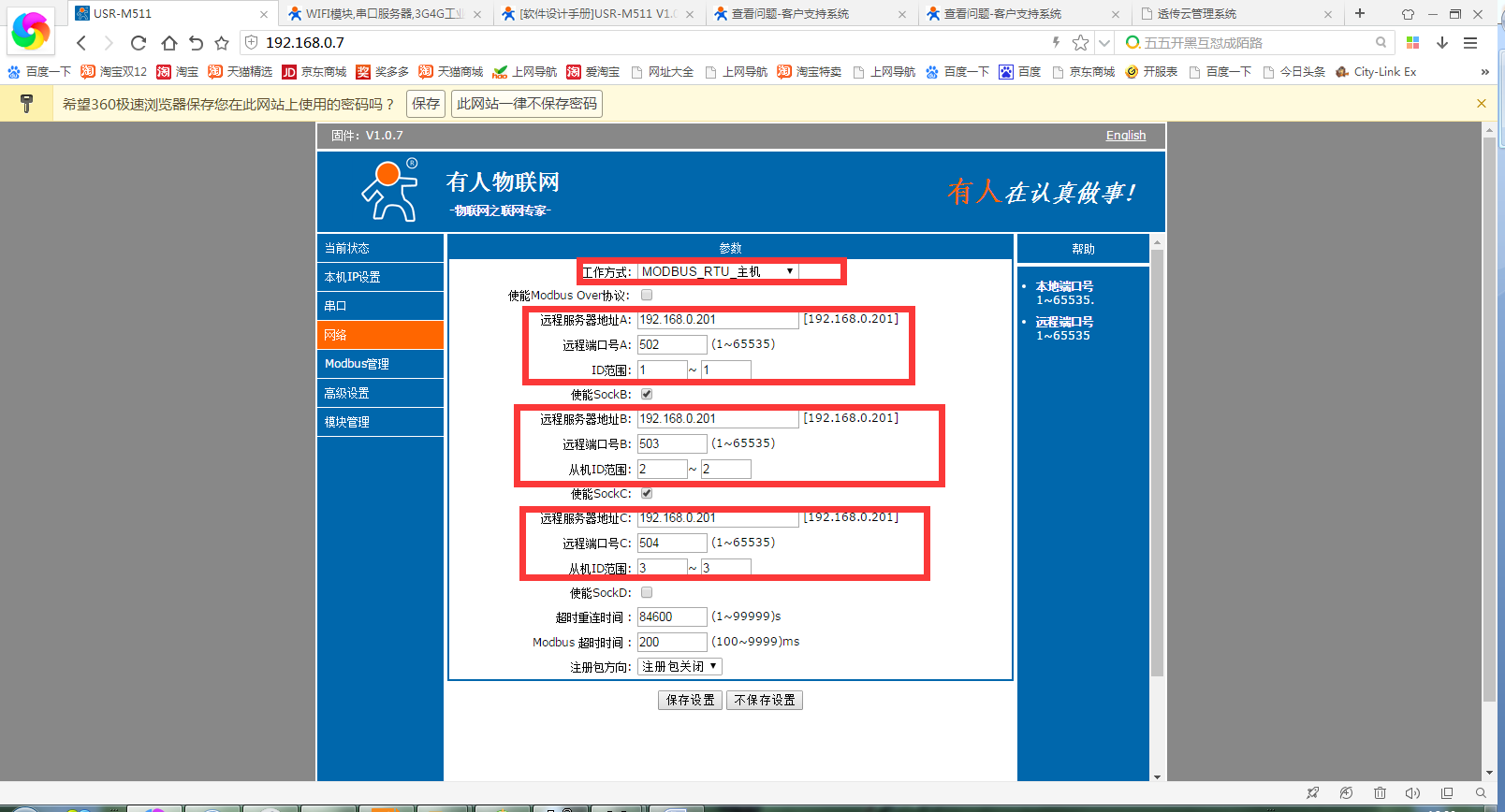 4、設置m511的參數,modbus rtu主機模式,添加3個modbus tcp 從機,ip為電腦ip,端口 502/503/504,id為1/2/3
