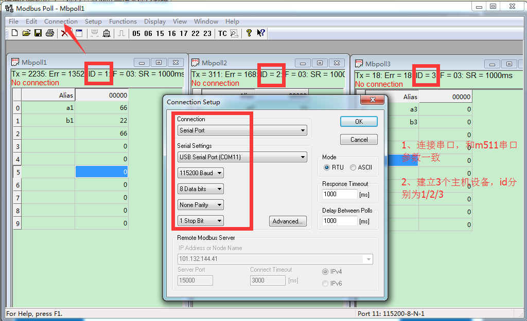 5、打開 Modbus Poll,設置正確的參數,M511 串口接Modbus_RTU_ Poll,所以將Modbus Poll設置為串口,RTU 協議, id為1/2/3和上面設置對應