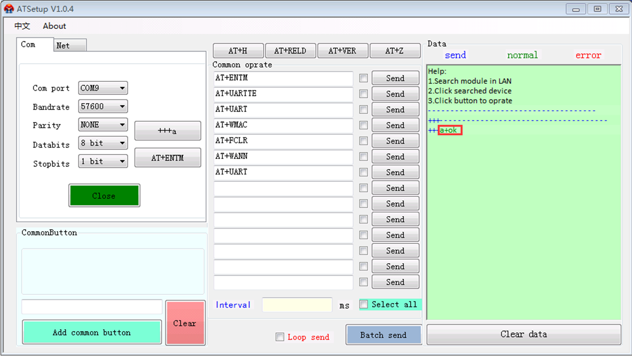 1>打開軟件,設置好串口參數,默認是57600,n,8,1,打開串口;點擊+++a,模塊會返回+ok的字符,說明進入AT指令成功