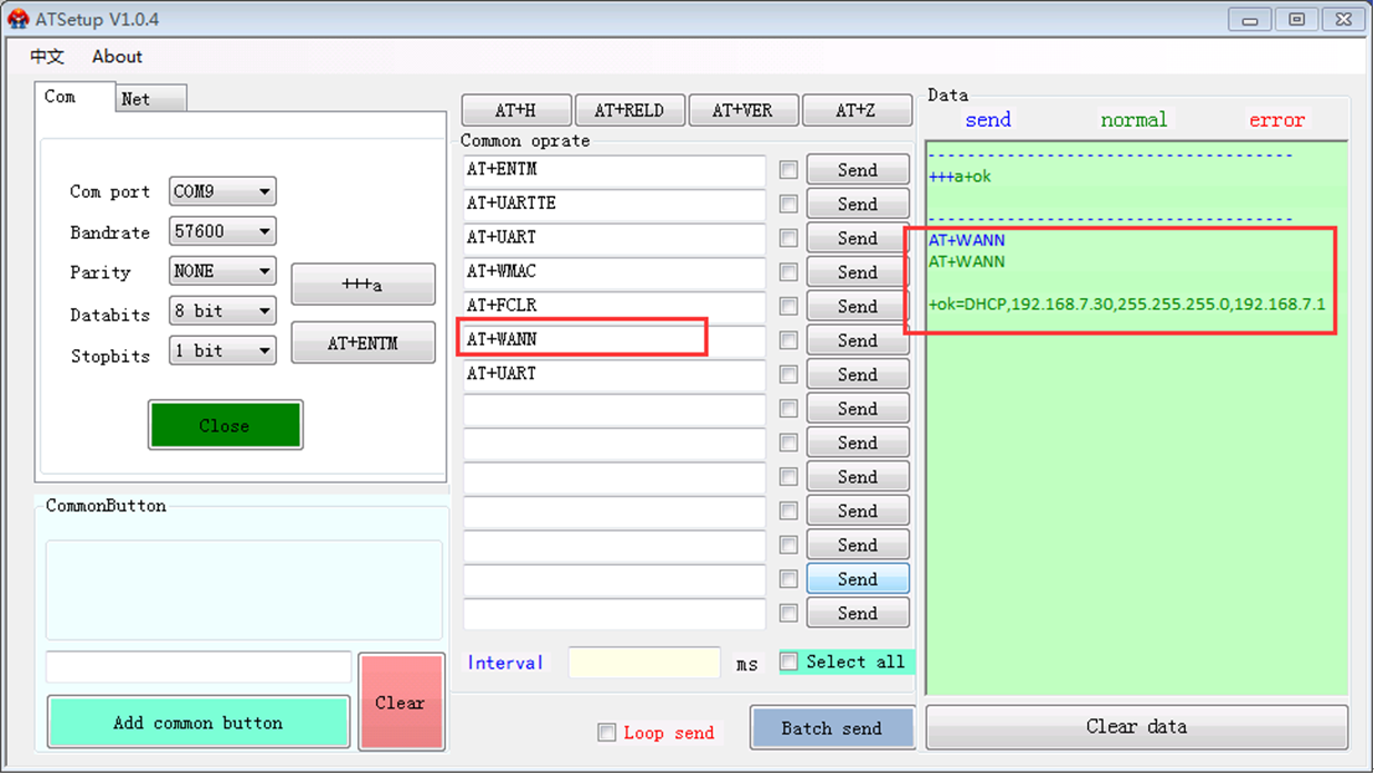 2>發送AT+WANN就可以查詢wifi模塊的WAN IP地址了;通過這個軟件也可以設置/查詢wifi模塊的其他參數,全面的AT指令見相關產品的軟件設計手冊。