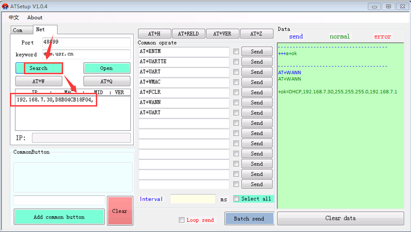 安裝上述軟件的PC和wifi模塊接到同一個路由器下,打開Net選項卡,點擊search,能夠搜索到wifi模塊的IP以及MAC信息的,見下圖