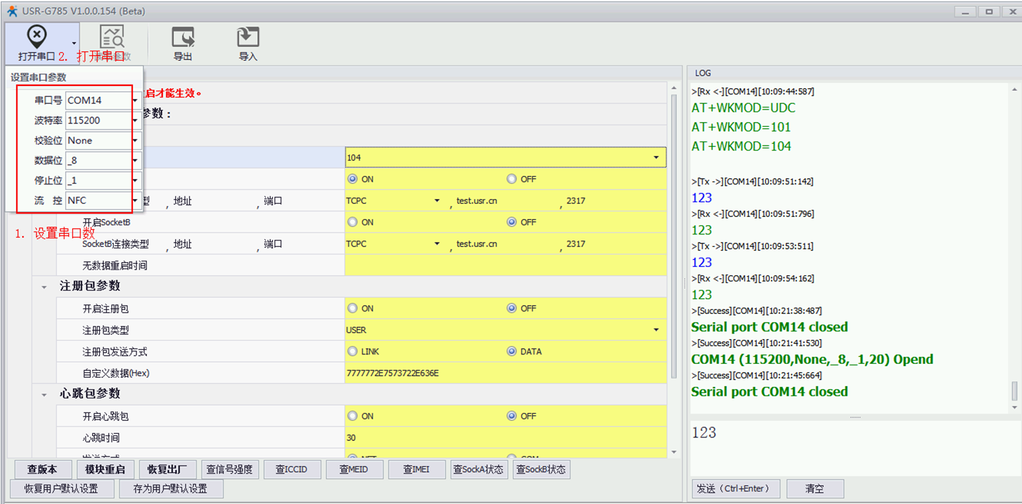 B.可以先讀取下參數(shù),可以看到,出廠默認(rèn)是工作的“NET”模式,服務(wù)器是我司測(cè)試服務(wù)器:test.usr.cn,端口號(hào)是:2317