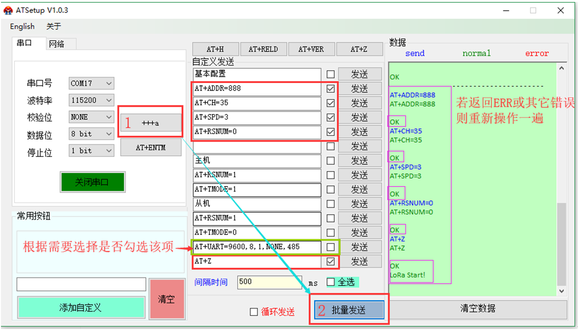 ③若參數配置過程中右側數據框返回錯誤,則從新點“+++ a”進入配置狀態,再點擊“批量發送”進行配置;