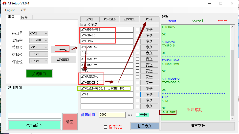2、打開串口后先點擊“+++ a”,再按照順序發送指令,等待參數設置完成即可(右側數據框返回“LoRa Start!”表示設備設置完成,重啟ok;若改了口數只返回OK,不會打印“LoRa Start!”)