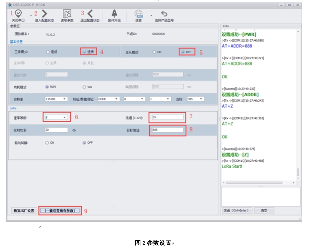 打開LoRa設置軟件(LG207和LG206-P選擇同一個),依次點擊打開串口(選擇A、B對應的串口號,串口參數:115200,None,8,1,NFC)、進入配置狀態、讀取參數、配置上表中的參數、一鍵設置所有參數,關閉LoRa設置軟件。