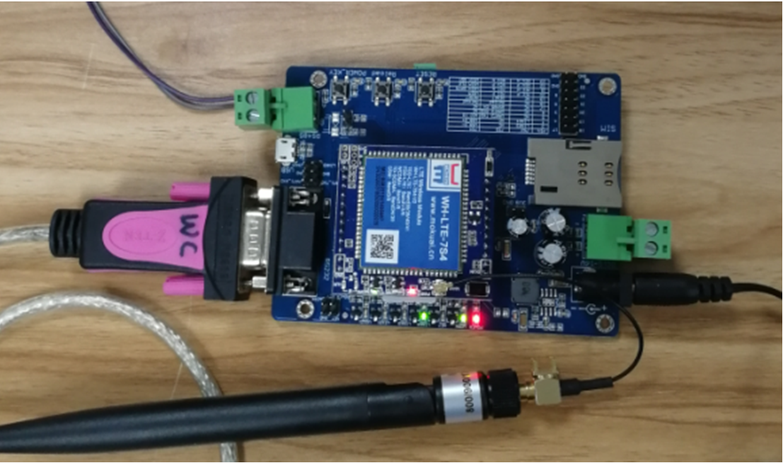 (1) 硬件連接:裝上sim卡,將模塊安裝在測試底板上,接上天線,用USB轉RS232將模塊連接到電腦上,供電