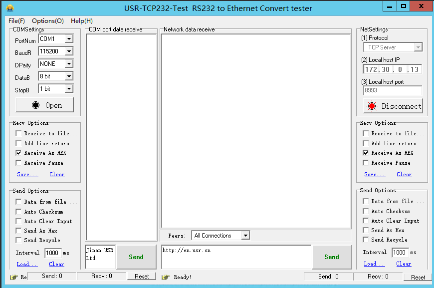 1. 先在服務器端打開一個網絡調試助手,設置成TCP server及本地端口號(這里設置成8993),開始監聽