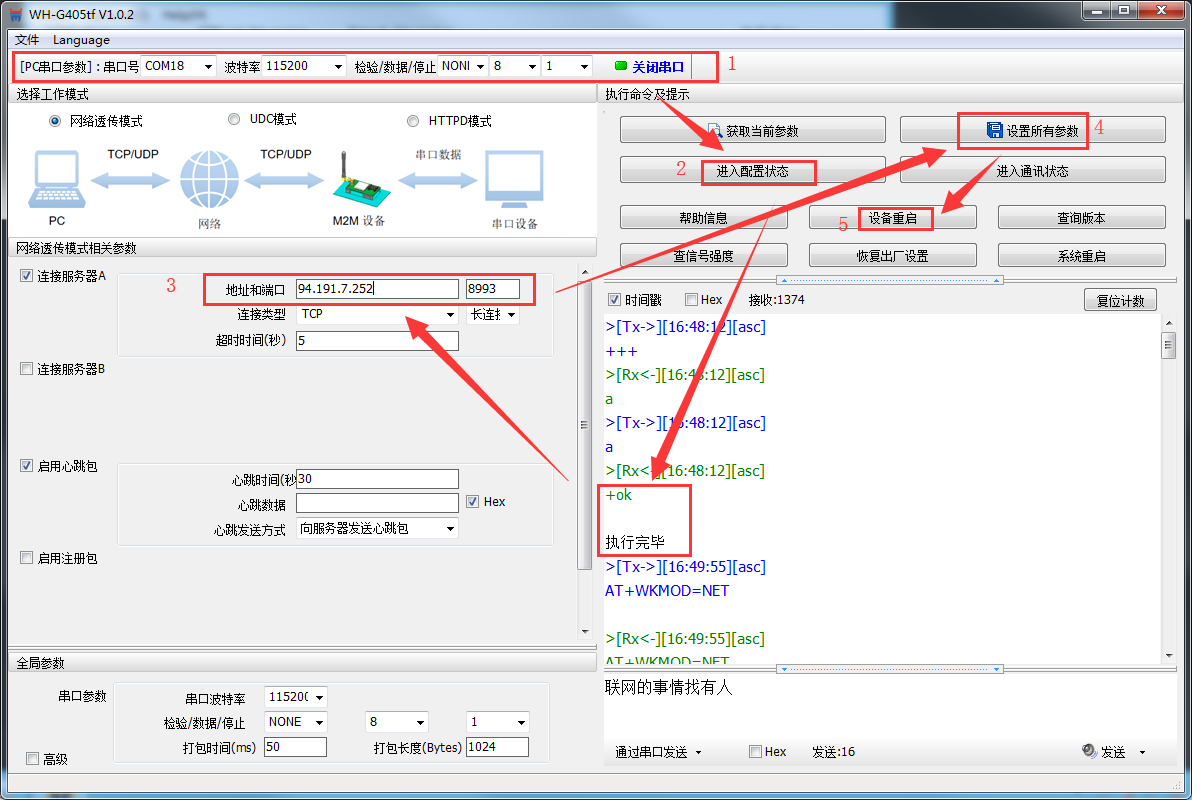 打開串口--->進入配置狀態--->成功的話,會返回執行完畢--->修改服務器地址和端口--->設置并保存參數--->模塊重啟