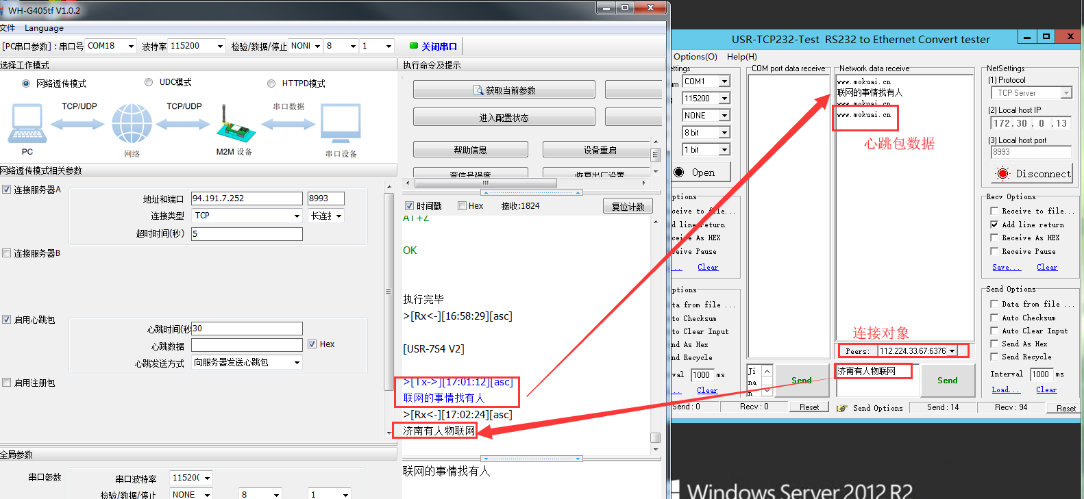 3. 模塊重啟后,在linka指示燈亮了后,在服務器端,可以看到已經有連接對象了,串口和服務器端能正常收發數據,當串口長時間不發送數據的時候,DTU會主動發送心跳包給服務器(該功能可以取消,具體參考7S4 V2的軟件設計手冊)。