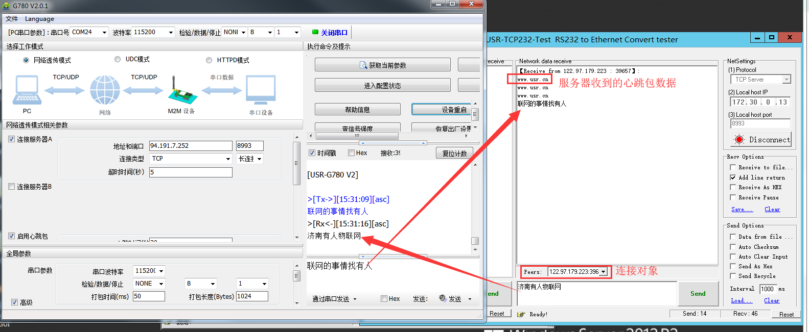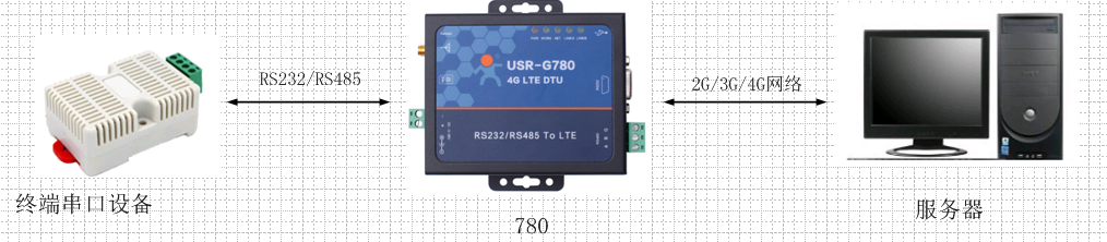 網(wǎng)絡(luò)拓?fù)浣Y(jié)構(gòu): 終端串口設(shè)備發(fā)送數(shù)據(jù)--->780 V2--->服務(wù)器