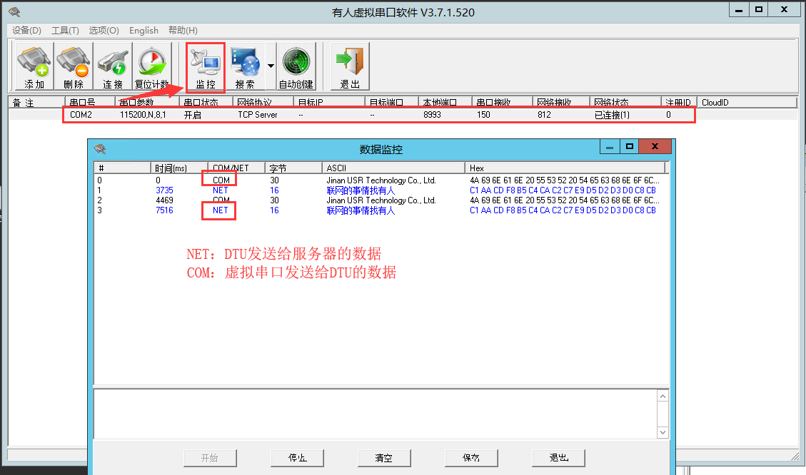 虛擬串口還有一個(gè)監(jiān)控的功能,可以監(jiān)控?cái)?shù)據(jù)收發(fā),見下圖