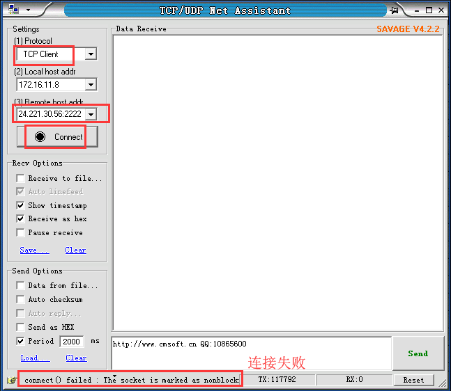 服務器IP和端口號是:27.221.30.56:2222,經過百度可以得知這個IP確實是公網IP地址,那我們可以用PC端軟件測試下這個IP和端口是否可連接的,PC端軟件做TCP client,然后設置遠程服務器地址,點擊“Connect”,可見連接失敗,這說明這個服務器是有問題的,如果PC端軟件連接不上的話,那么DTU也是無法連接成功的,但是服務器具體是有什么問題,需要跟服務器端的工程師來確認,我們作為DTU的供應商,沒法判斷服務器端的問題的。