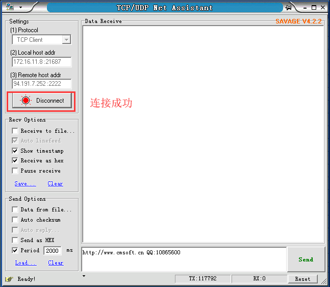 服務器IP和端口是:94.191.7.252:2222,我們再用軟件測試,可以連接成功。那么用DTU也是可以連接這個地址和端口的。