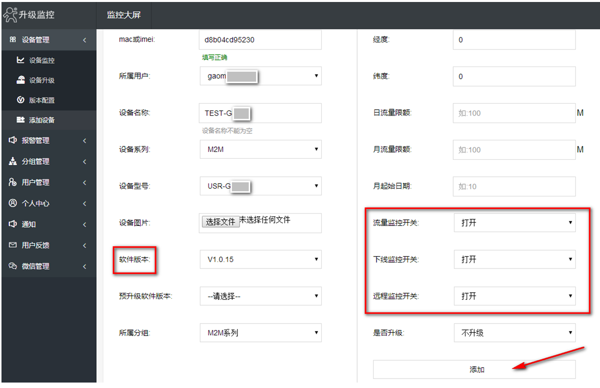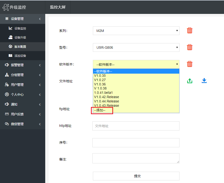4、點擊“版本配置”,系列選擇M2M,型號按照實際情況填寫,軟件版本選擇添加--輸入自己設備目前的版本號