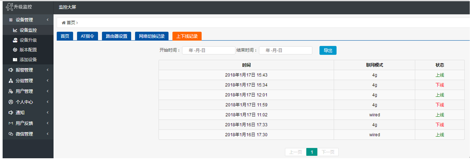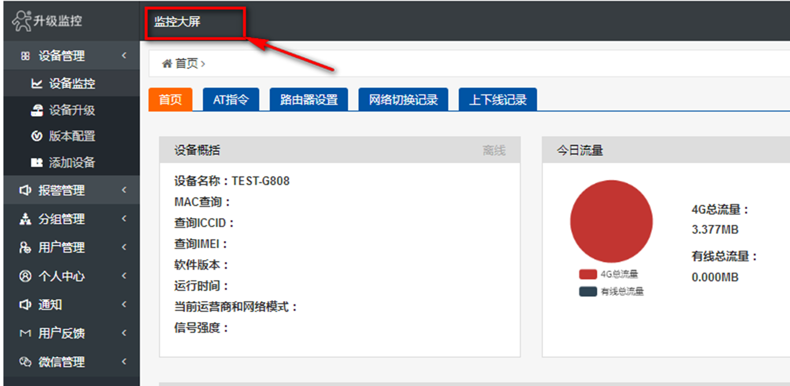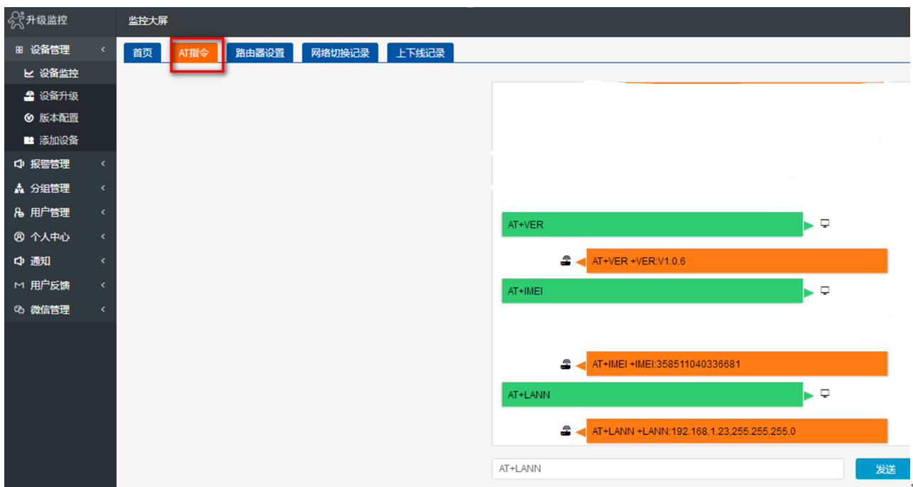 5)遠程監控開關:遠程監控功能打開后,可以查看設備的運行狀態,遠程發送AT指令控制設備