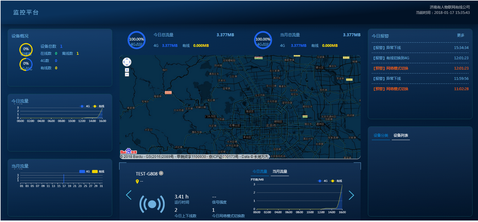 4)流量監控開關:當需要使用流量報警功能時“流量監控開關”需打開。日流量限額、月流量限額,用于進行流量報警功能,分別表示日最大使用流量和月最大使用流量。
