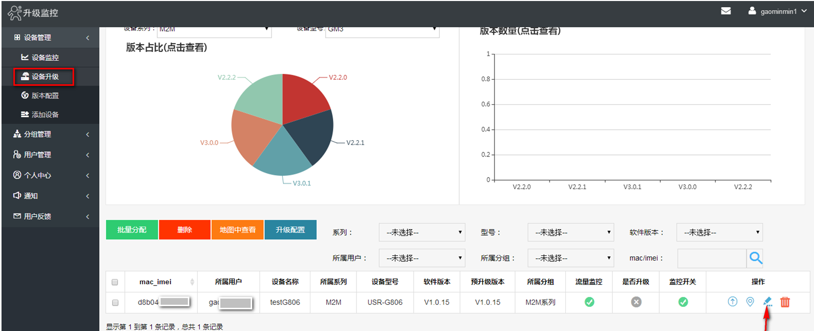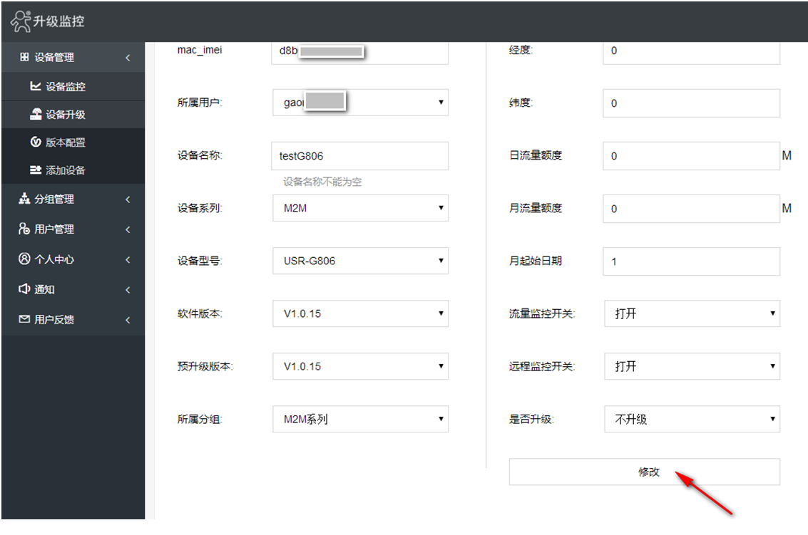 點擊“設備升級”,對于要修改的設備信息,點擊編輯按鈕,出來修改信息的界面后,直接更改,更改完后,點擊“修改”即可保存信息。