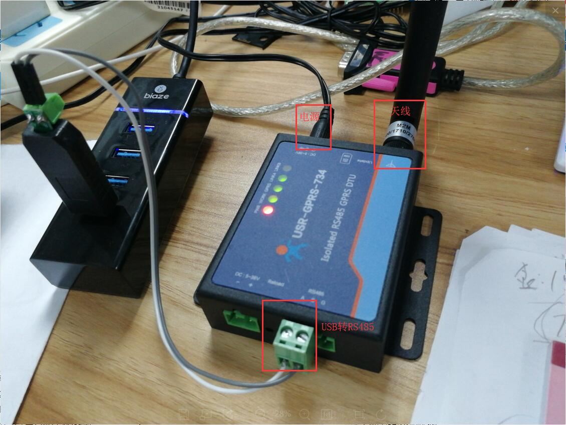 (1) 硬件連接:裝上sim卡,一定要接上天線,734的串口通過USB轉RS485接到PC上,用我司提供的適配器供電。