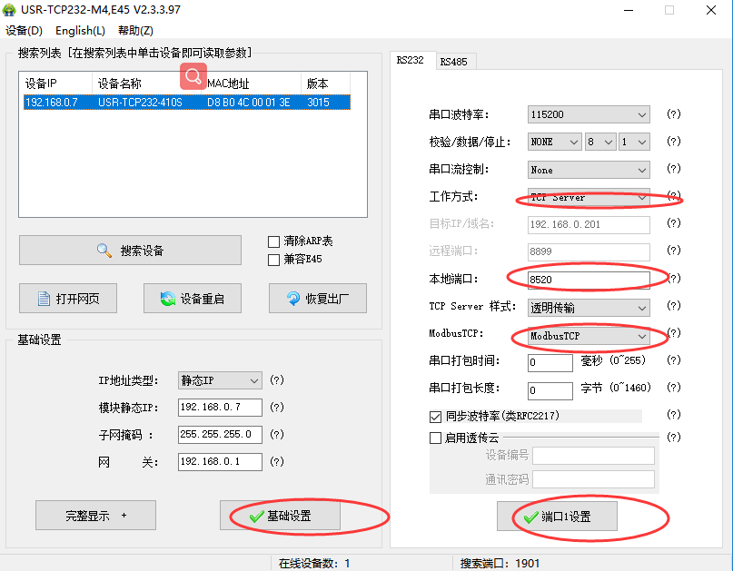2. 打開(kāi)設(shè)置軟件:USR-TCP232-M4-setup-V2.3.3.97,然后工作方式選擇“TCP SEVER”然后將本地端口號(hào)設(shè)置為“8520”,將modbus 改為“modbus tcp”然后端口1設(shè)置確定下,然后設(shè)備重啟下。
