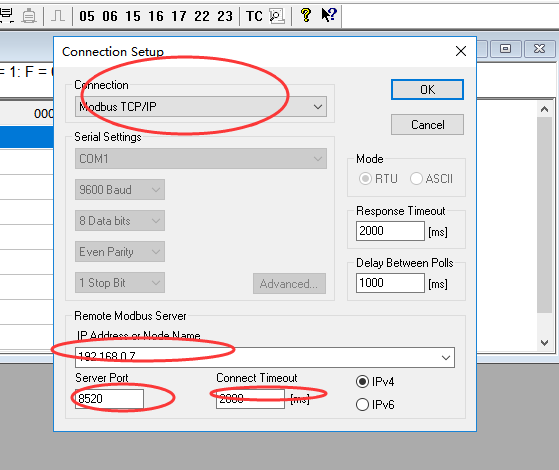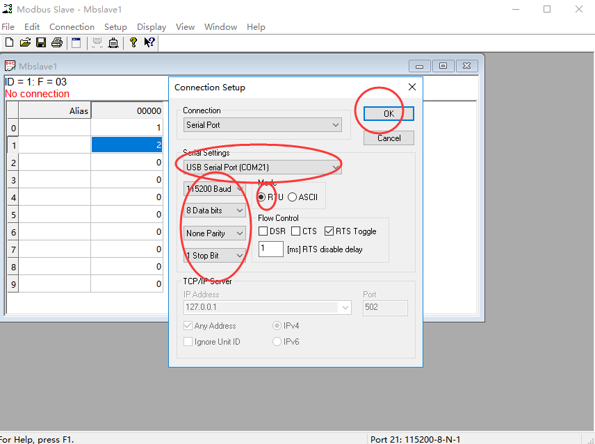 3. 打開(kāi)Modbus Slave,設(shè)置參數(shù)如圖所示