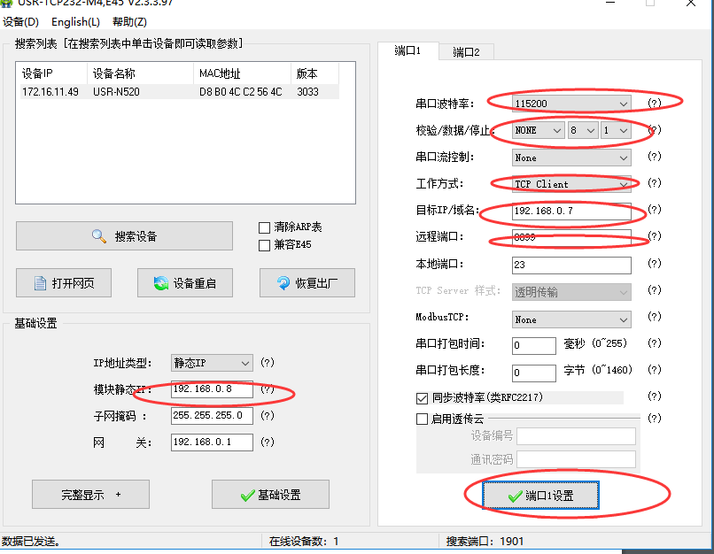 2. 設(shè)置N520 (第二臺(tái))的參數(shù):打開設(shè)置軟件USR-TCP232-M4-setup-V2.3.3.97,設(shè)置他的工作方式為TCP clinet,設(shè)置他的“目標(biāo)IP/域名”為:192.168.0.7,設(shè)置遠(yuǎn)程端口號(hào)為8899,然后點(diǎn)擊“端口1設(shè)置”,點(diǎn)擊“基礎(chǔ)設(shè)置”再點(diǎn)擊“設(shè)備重啟”。如圖所示: