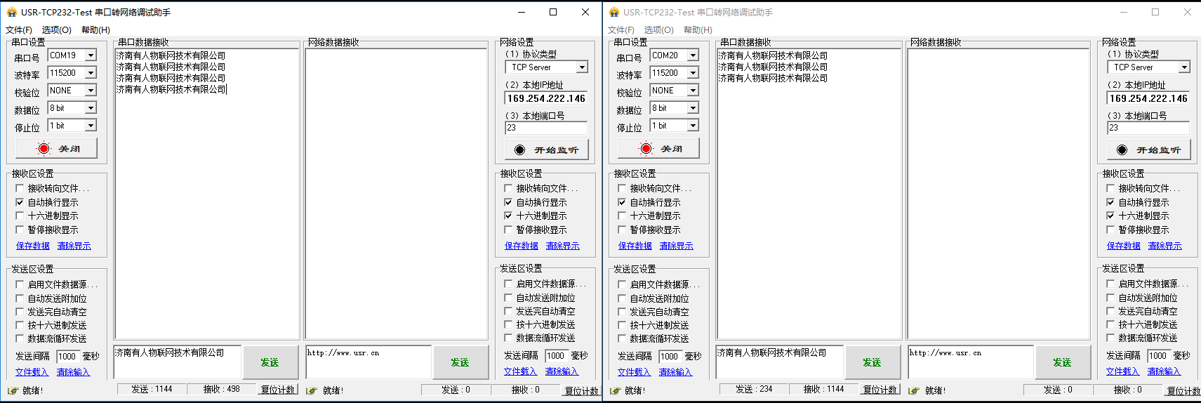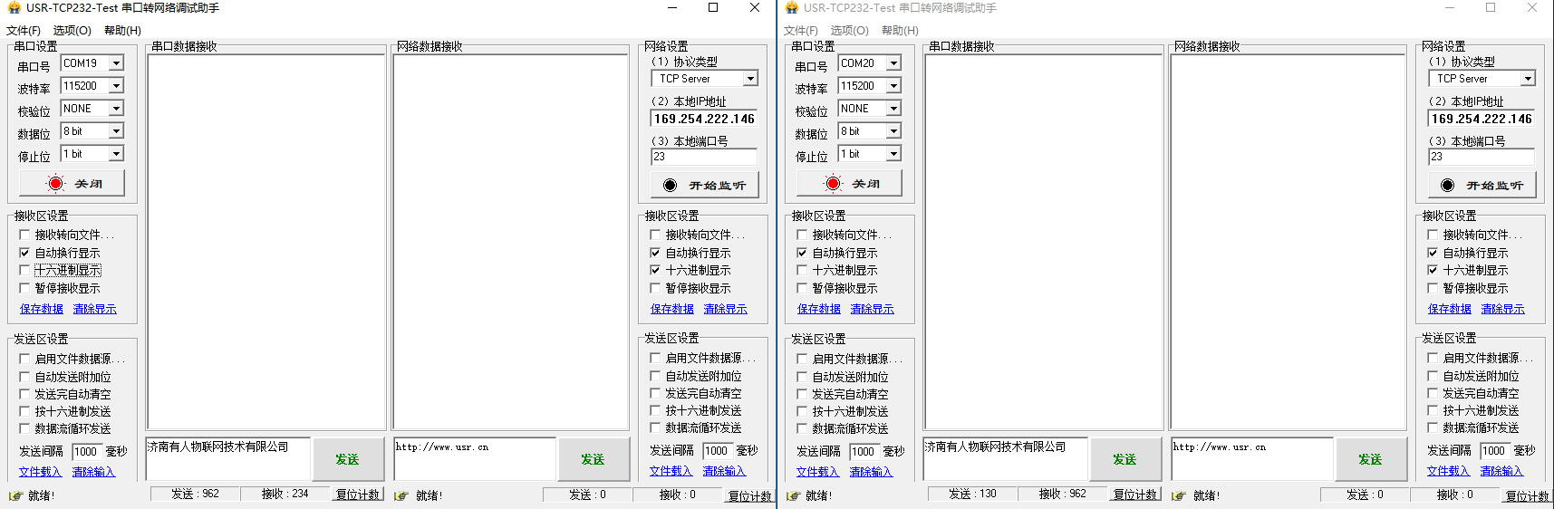 3. 將兩太設(shè)備通過網(wǎng)線鏈接,分別用USB轉(zhuǎn)232串口線將他們鏈接到電腦上,打開兩個(gè)測(cè)試軟件(USR-TCP232-Test-V1.3),分別打開兩者對(duì)應(yīng)的串口:
