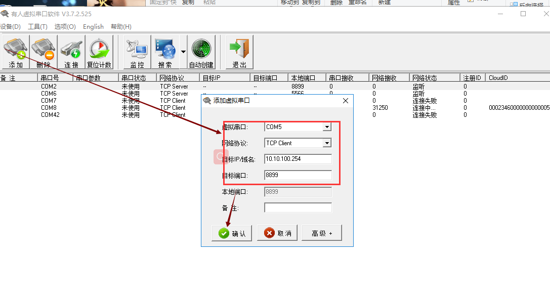 1>添加虛擬串口,網絡協議TCP client,服務器IP地址10.10.100.254,服務器端口號8899,確認